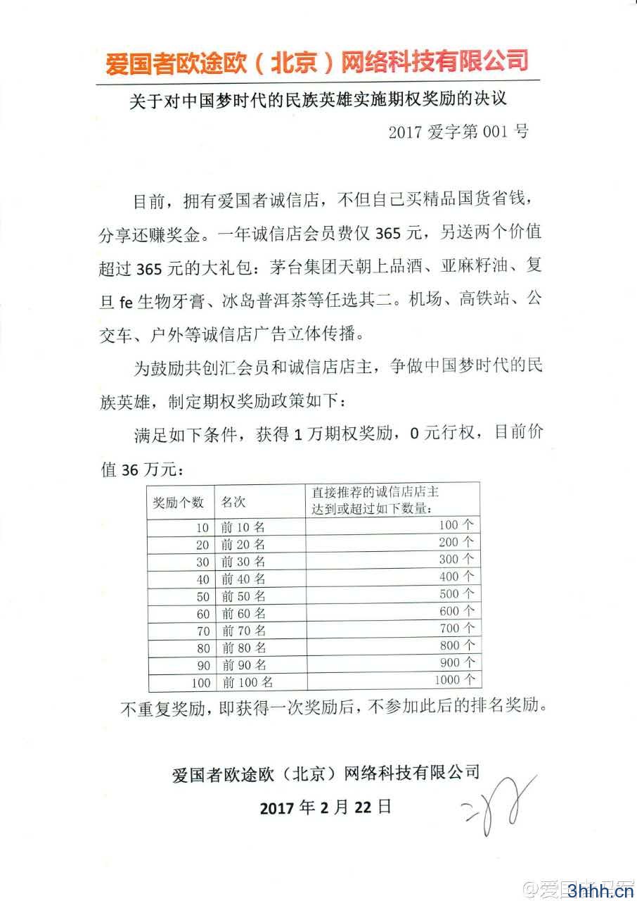 为鼓励支持竞质排名诚信事业做出贡献的民族英雄,冯军将捐出550万股诚信联盟的原始股(现价值1.98亿),给帮助朋友们开诚信店的550位民族英雄,一人一万股期权(现价值36万,五年后有可能价值6000万),大家一起零风险创业,抱团支持各行各业竞质排名胜出的前三名国货精品吧!